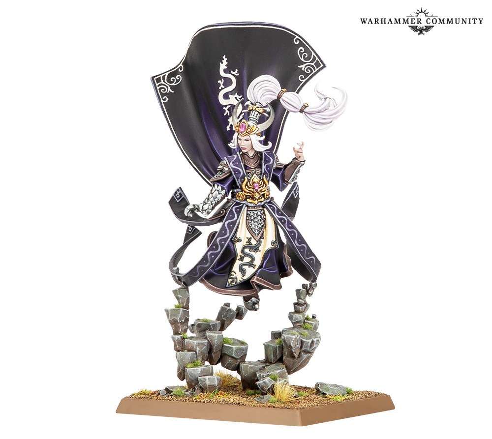She has no massive weapon pointing menacingly at the enemy—because she is the weapon. Her human form floats down atop earthen magic, rocks swirling around her as she descends from storm clouds. This pose mirrors her dragon form’s upward movement, subtly telling a story of duality. Even the crown stays constant between forms—just transformed by her magic. Little touches like that are what make Warhammer great.