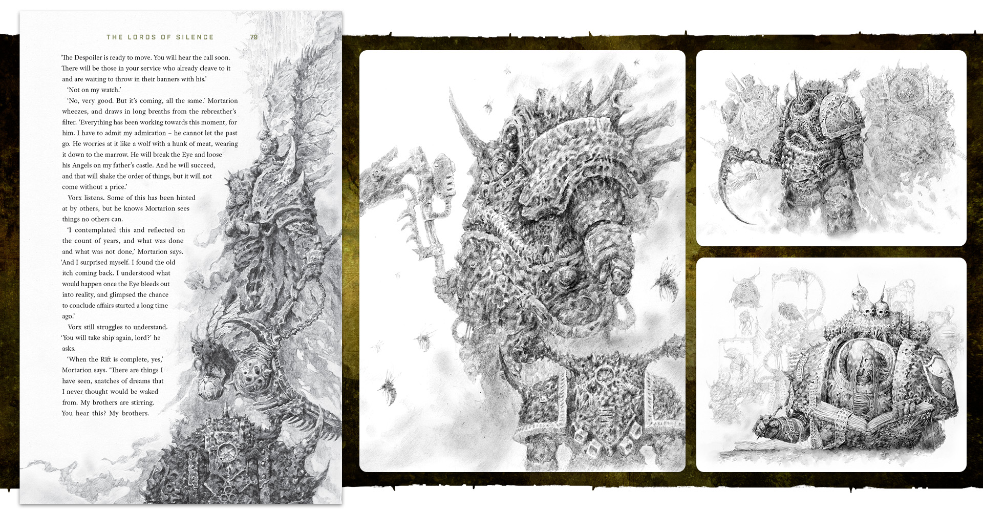 Shortly after the galaxy was torn in half by the Great Rift, the forces of Chaos surged like pus through a wound. Naturally, the Death Guard were in the thick of it. Thanks to Mortarion’s return, they had new purpose – and new plagues – to spread across Imperial space. That’s where The Lords of Silence picks up.