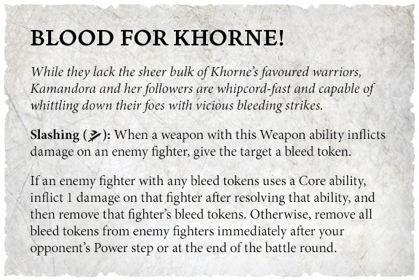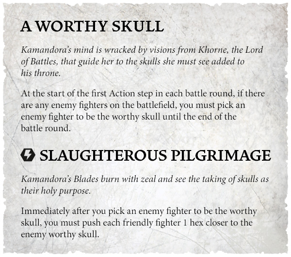 Kamandora herself — dubbed Mother of Hate — is guided by visions from Khorne to select one enemy fighter as A Worthy Skull each round. This unlucky target becomes the focus of the entire warband’s attention. Once chosen, the entire warband gets pushed toward the mark automatically, kicking off the ritual bloodletting early. It’s thematic, it’s brutal, and it guarantees round-by-round action.
