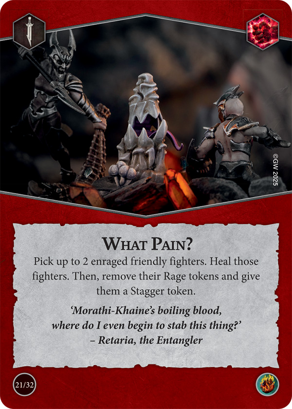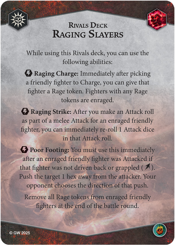 Alongside the new warband comes the Raging Slayers Rivals deck — a perfect companion for Kamandora’s style, but flexible enough to work with any warband. The central mechanic is Rage, triggered whenever a fighter Charges. They gain a Rage token, which buffs their melee attacks with a re-roll. Sounds great, right?
