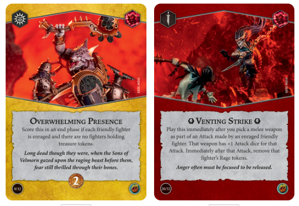 The deck leans heavily into managing these Rage tokens. You’ll spend them for boosts, healing, or scoring objectives — but timing is everything. You can score Overwhelming Presence only if all your fighters are enraged and not holding any treasure. Other cards, like Venting Strike and What Pain?, let you trade Rage for damage or healing, keeping things dynamic and responsive.