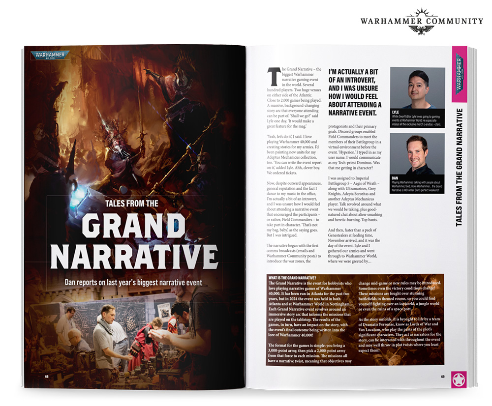There’s a full recap of last year’s Grand Narrative at Warhammer World, with staffers Dan and Lyle sharing their tales from the frontlines. Alongside this is a featured Ynnari army that took home honors — a real treat for anyone who enjoys beautifully painted Eldar with a twist.