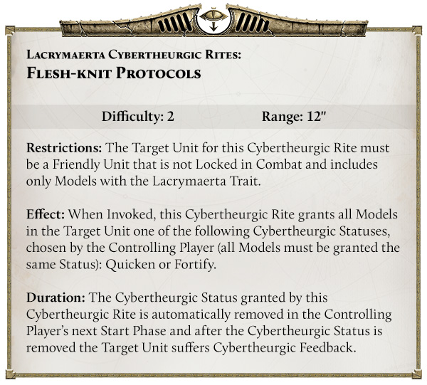 - Lacrymaerta’s “Flesh-knit Protocols” lets you choose between making units faster and quicker to strike, or tougher and stronger. Think of it as popping “Adrenaline Overdrive” on your metal monstrosities.