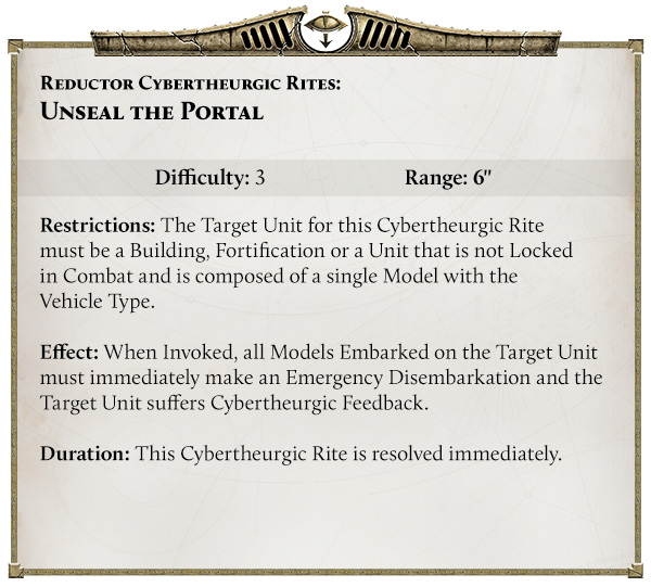 The real magic (ahem, cybertheurgy) comes in with Cybertheurgic Rites. Each Arcana gets its own set of techno-prayers you can invoke to boost units on the fly.