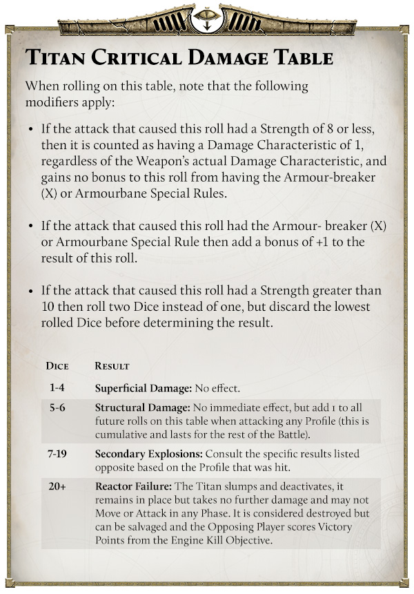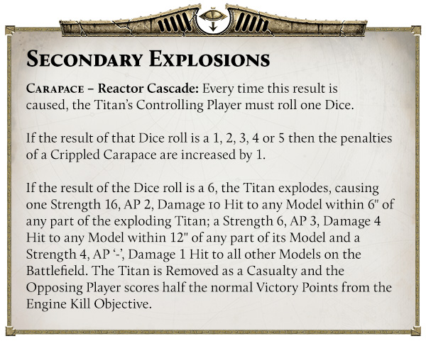 Rolling high on this table leads to explosions, reactor meltdowns, and potentially the total collapse of the Titan. The results range from nothing at all, to structural weaknesses, to a full-on reactor cascade that vaporizes everything nearby. If the Carapace explodes, you’re looking at Strength 6 hits to everything within 12 inches. And yes, that includes your own army if you’re too close.