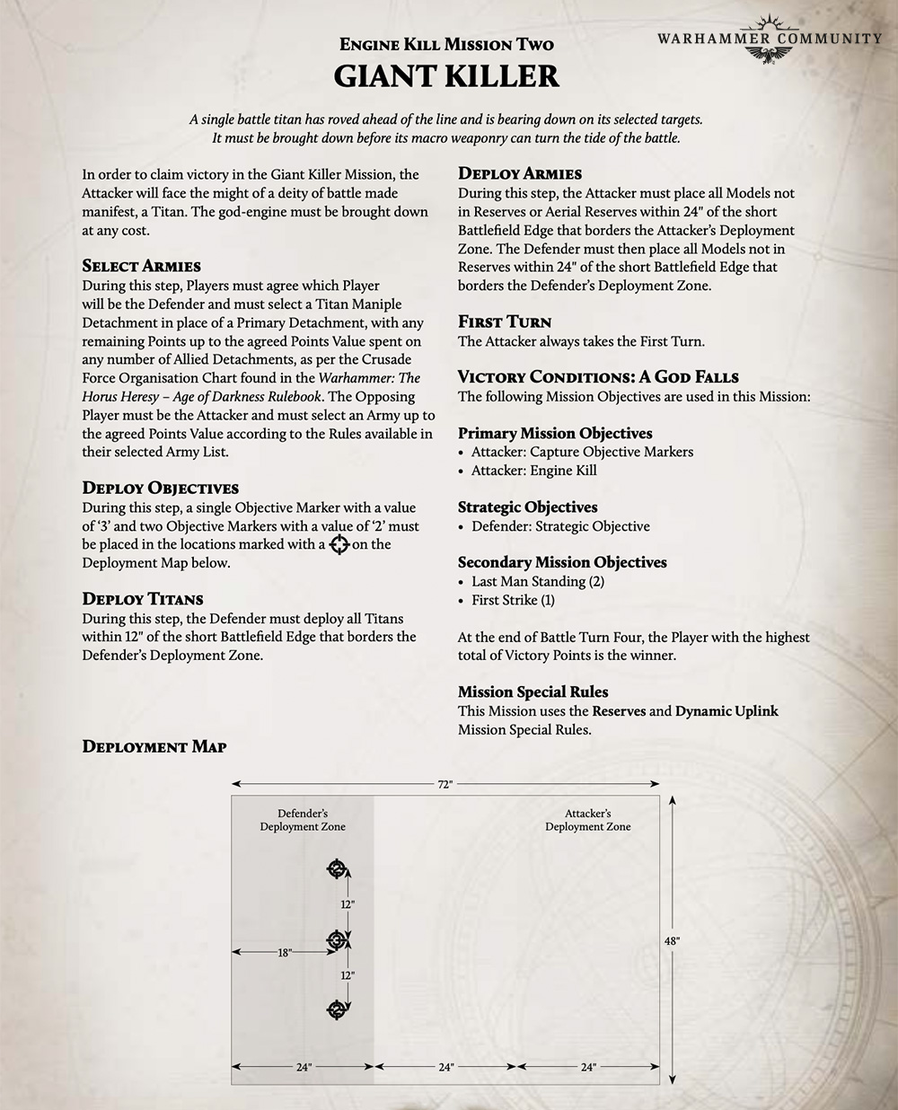 In Giant Killer, one side brings a Titan, and the other throws a normal army at it. This asymmetric scenario turns a Titan into a boss fight. The Titan player must balance between deleting battlefield threats and scoring VPs by destroying objectives beyond the board. The attacker, meanwhile, swarms objectives and tries to wear down the machine one armor plate at a time.