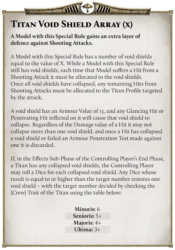 The regeneration chance depends on the Titan’s Crew Trait. A Minoris crew rolls a 6+, while an Ultima crew gets theirs back on a 3+. You can pay to upgrade the crew, which impacts everything from void shield recovery to ballistic skill.