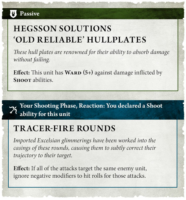 Your vessels still ferry troops across the skies, though now only in your turn and when not locked in combat. But now you get to nominate a Flagship, giving it the title and the teeth to match. With the Flagship, you can take two Endrinworks, which add spicy upgrades to your ship’s already nasty profile. For instance, Old Reliable Hullplates give you a Ward 5+ against shooting. Meanwhile, Grandiose Fuselage boosts your Control stat by five, which is huge when facing armies that try to seize control of objectives. Then you’ve got Tracer-Fire Rounds, ignoring negative hit modifiers as long as all guns target the same enemy. On top of that, your Admiral can call for a one-time salvo with re-rolls of 1 to hit. You can bet that salvo’s going into something big and expensive.