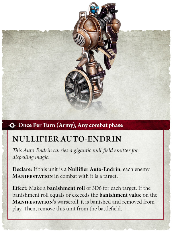 You get three flavors: the Nullifier Auto-Endrin, which tries to banish Manifestations on a 3D6 roll; the Stuncloud Auto-Endrin, which lowers enemy Control scores (always clutch for objective games); and the Grudgeblast Auto-Endrin, which suicides into combat and deals mortal wounds on a 2+. Each has movement 12″, Health 5, and a 4+ save, and you can keep replacing them with lucky rolls in your Hero phase.
