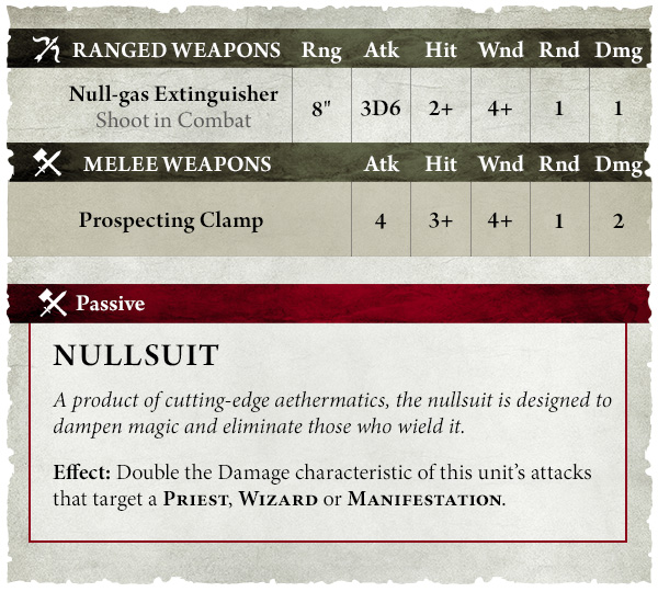 The Null-Khemist is your go-to for turning wizards into regretful stains. These duardin wear fully sealed, aether-powered anti-magic suits that provide a 5+ Ward against spells, prayers, and manifestations for nearby units. When the Null-Gas Extinguisher fires off, it drops 3D6 attacks that hit on 2+ and wound on 4+, but here’s the kicker: double damage against Priests, Wizards, and Manifestations thanks to the Nullsuit rule.