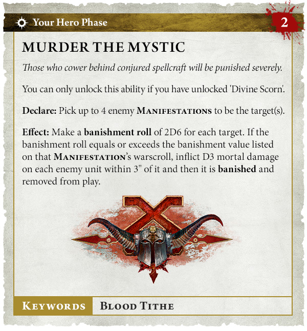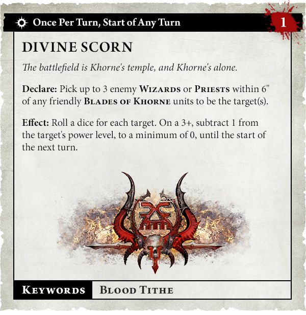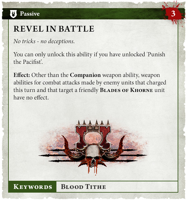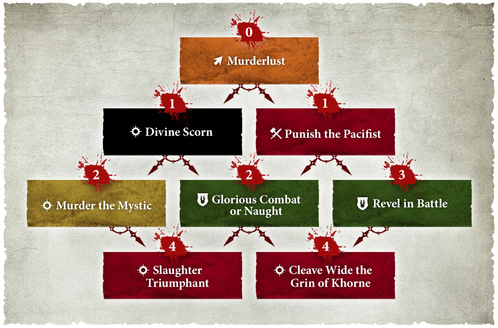 The biggest change is how Blood Tithe points are spent. You still earn a point for every unit destroyed, friendly or not—Khorne doesn’t care, remember—but now you spend them to unlock permanent buffs from a branching tech tree instead of triggering one-time effects. The tree starts with Murderlust, a free ability that lets you roll an extra die on charges and pick the result… at the cost of D3 mortal wounds. That’s on-brand.