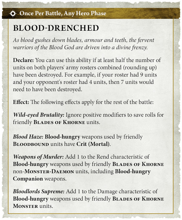 There’s also a one-time Blood-Drenched ability that triggers when over half of both armies’ units are wiped out. From that point on, it’s total carnage. Bloodbound units gain Crit (Mortal), most Khorne units gain extra Rend, and MONSTER units like Bloodthirsters get a flat bonus to their damage.