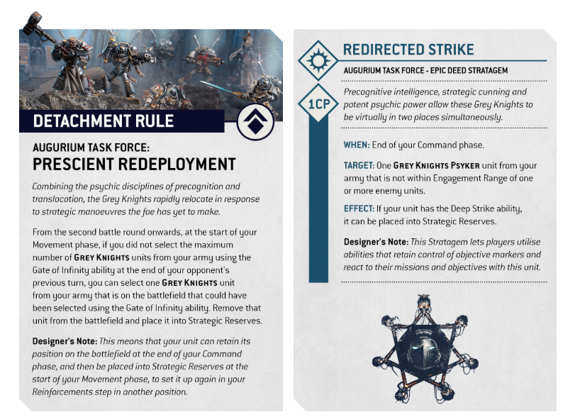 Gate normally blinks units away at the end of the enemy Fight phase, which can cost you primary points. The Augurium Task Force laughs at that problem. Prescient Redeployment lets you port a unit out at the start of your own Movement phase, after holding an objective in your Command phase. Then Redirected Strike lifts a Psyker unit at the end of your Command phase once scoring is banked. Thus you keep sticky board control while still playing teleport tag.