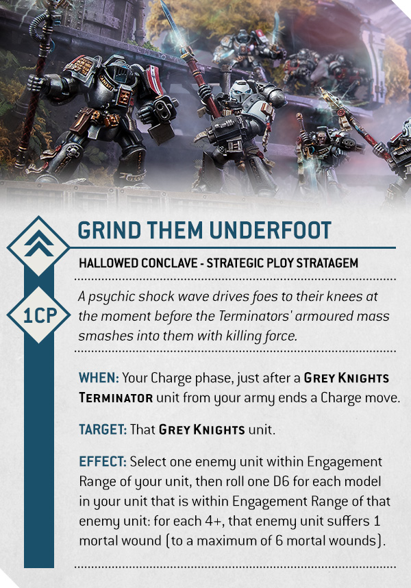 If you prefer anvil to scalpel, the Hallowed Conclave builds around Terminators. Grind Them Underfoot slaps mortal wounds on whatever they charge, rolling a die per engaged model on a 4+. Consequently, your big silver bricks ram home and leave paste underfoot. Because you still have teleport tricks elsewhere, these slow boys can appear exactly where they matter.