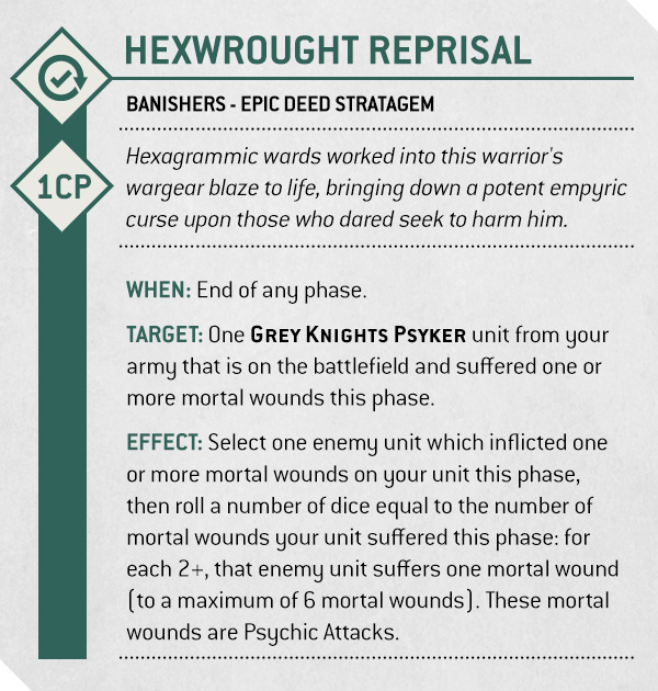 Expeditious Exit even pulls a Psyker infantry unit out from combat at the end of the opponent’s Fight phase, ignoring the usual restrictions. Therefore you can fight, then vanish before the guns turn your knights to scrap.