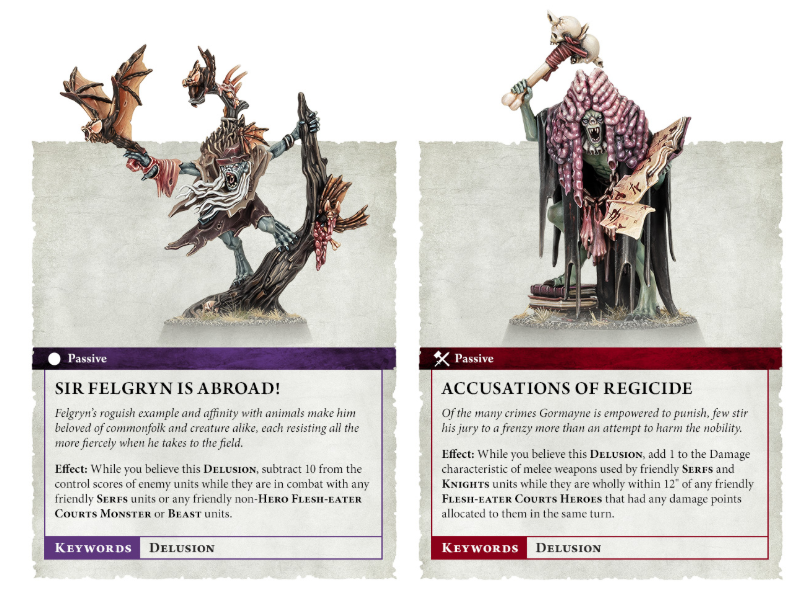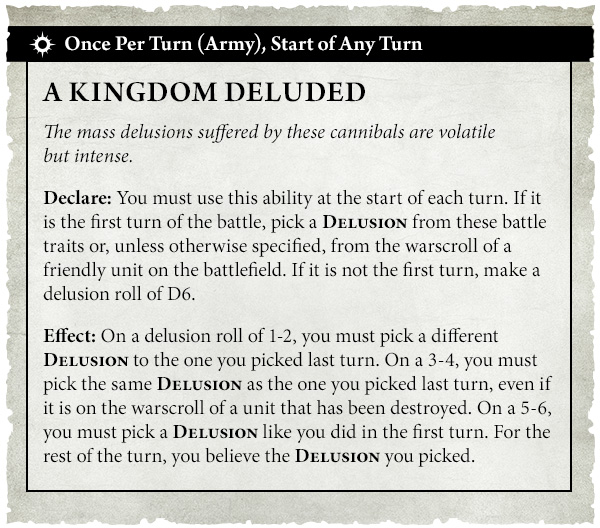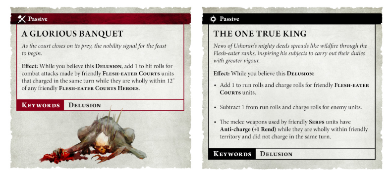 This system of Delusions is deeply tied to the lore of the Flesh-eater Courts, where the characters experience wildly fluctuating mental states that drive them toward either acts of grandeur or savage hunger. It’s a fitting rule for an army that’s all about madness and frenzy.
