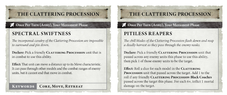 The first Army of Renown, The Clattering Procession, is a cavalcade of incorporeal cavalry that brings a new meaning to “ghost ride.” Units like Reikenor the Grimhailer and rattling Black Coaches thunder across the battlefield, phasing through everything in their path. You can even turn one of these Black Coaches into a hero, which gives you ridiculous flexibility. With Spectral Swiftness, your units can retreat or reposition through enemy lines without being pinned down. This is a nightmare for anyone trying to lock down your cavalry.