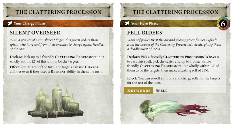 The Pitiless Reapers ability ensures your ghosts do actual damage while ghosting past enemies. Every model in the unit rolling mortal wounds feels like your opponent getting kicked in the face by a phantom horse. On top of that, the Silent Overseer hero can force up to three nearby units to charge even after retreating, making Hexwraiths and Black Coaches even more brutal. Spells like Spectral Lashes add movement bonuses, and Fell Riders lets you re-roll run and charge rolls, guaranteeing you close the gap and smash into enemies at exactly the right moment. This army is fast, punishing, and oh-so satisfying when it sweeps past enemy lines.