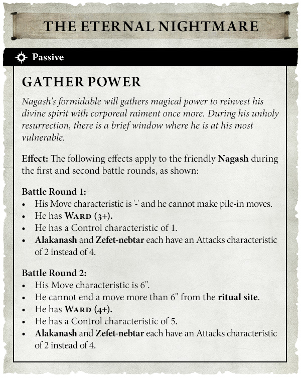 The second Army of Renown, The Eternal Nightmare, is all about bringing the big boss, Nagash himself, onto the table. Summoning him requires a Nexus of Grief terrain piece and a bit of patience. For the first two battle rounds, Nagash is gathering power, moving slowly, and taking less direct action. His ward save starts incredibly strong, making him durable while he charges his ethereal engines. Once he’s up and running, Nagash dominates, while your Nighthaunt infantry swarm around him, controlling objectives and acting as meat shields for the big guy.