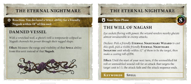 Abilities like Damned Vessel let a hero act as a conduit for Nagash’s spells, which is insane for combo plays. The Will of Nagash provides near-invulnerability for nearby units, failing attacks on unmodified rolls of 1-3. If you want to play a long-game strategy with scary invulnerable ghosts and one planet-killing necromancer, this army nails it.