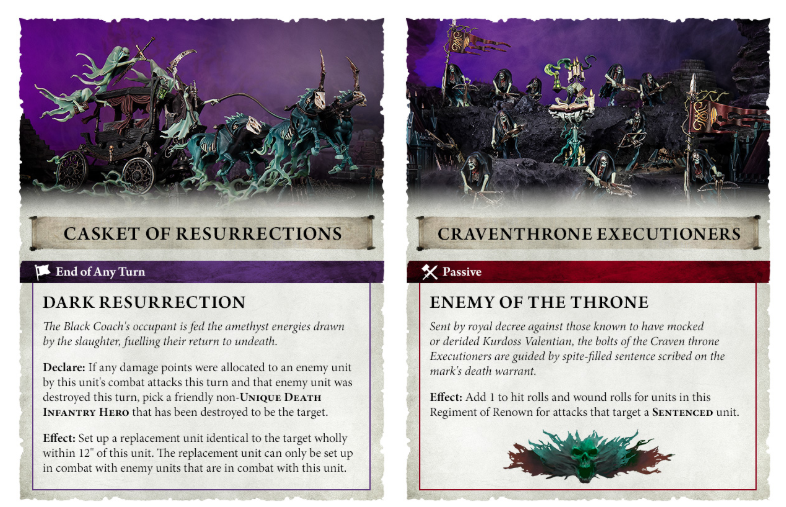 The Nighthaunt get access to some amazing tools beyond their core armies. The Casket of Resurrections can revive destroyed non-Unique Death Infantry Heroes, letting you recycle units and maintain battlefield dominance. The Craventhrone Executioners add extra firepower against “sentenced” enemy units, perfect for players who like precision strikes and thematic flair. These abilities combine strategy and flavor, giving every Nighthaunt army a sense of cohesion and sinister elegance.