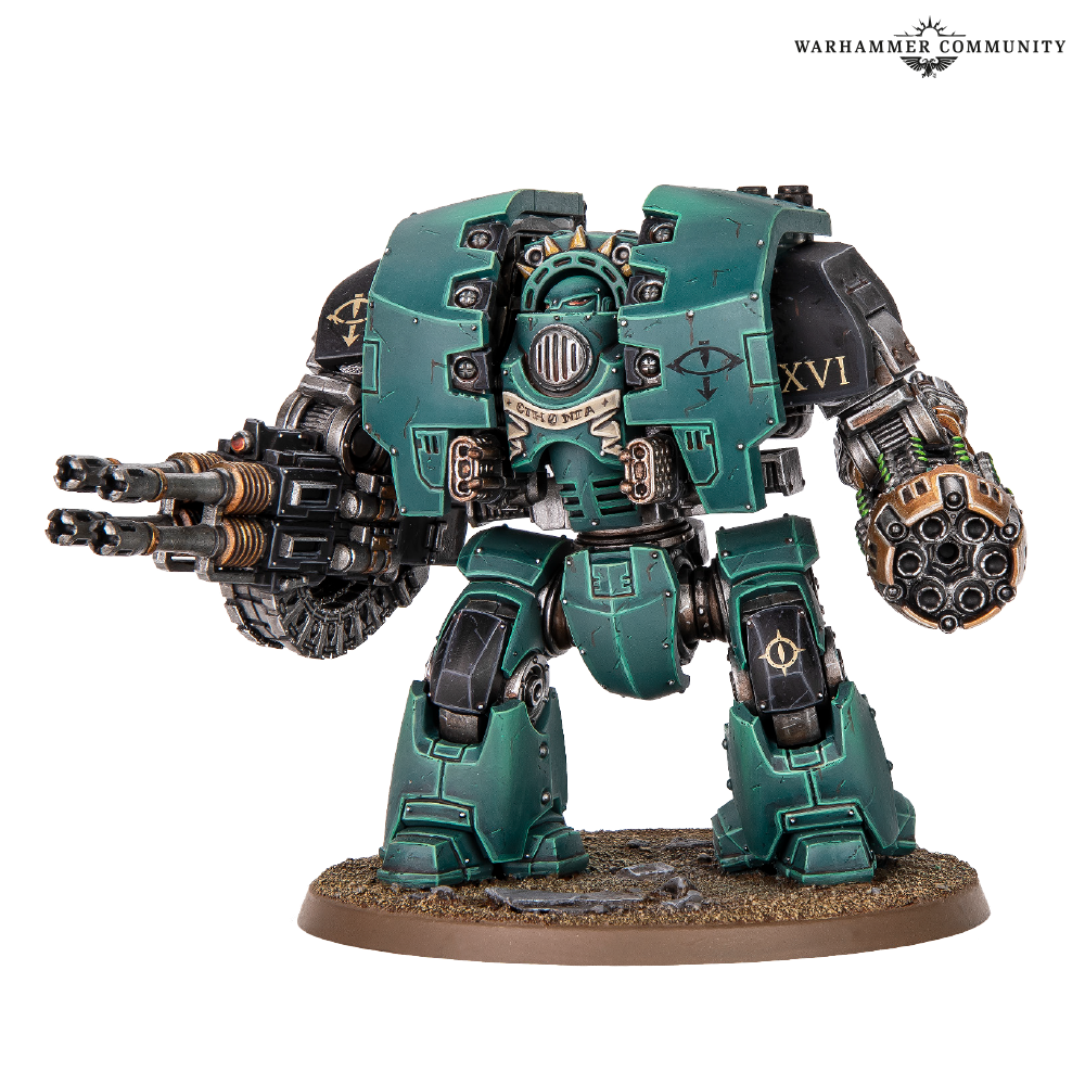 Mid-range punch comes from two Castellax Battle-automata, towering combat robots with claw-like shock chargers. They can carry circular power blades, bolters, or flamers and come with shoulder-mounted options including mauler bolt cannons and darkfire cannons.