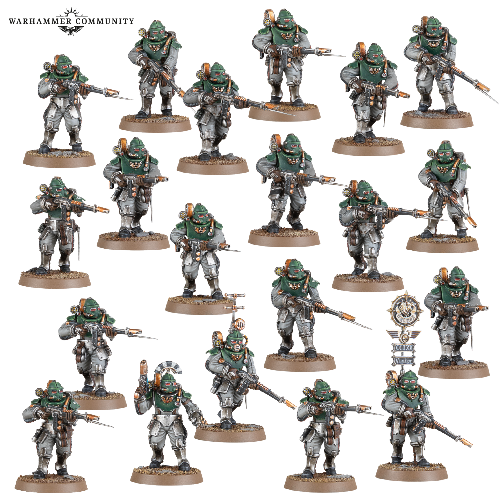 Finally, the Solar Auxilia Combat Force gives you humans relying on skill, numbers, and tactical support. The box includes a Lasrifle Section of 20 infantry, a Tactical Command Section, Hermes Sentinels, and a Leman Russ Strike Tank. Infantry can be customized with grenades, bayonets, pouches, flasks, and other accessories, allowing endless squad variety.