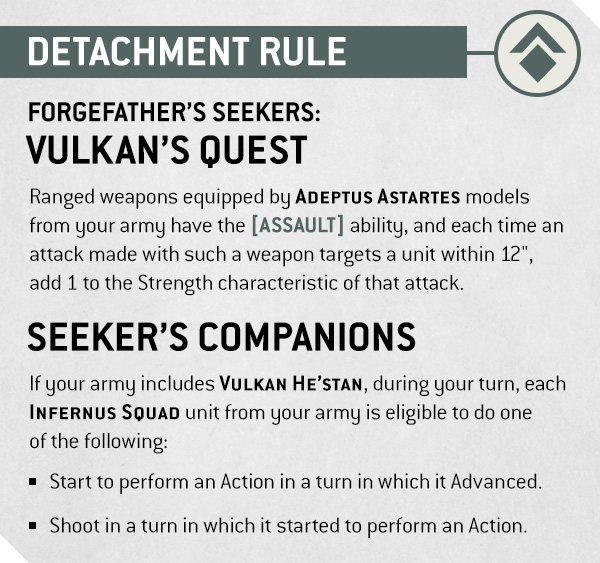 The Forgefather’s Seekers Detachment is the spiritual successor to the Firestorm Assault Force, focusing on close-range firefights where every shot counts. Every ranged weapon in your army gains the Assault ability and a bonus Strength when shooting at targets within 12 inches. That’s classic Salamanders play: get in close, hit hard, and set the battlefield ablaze. But what really makes this detachment shine is the new Seeker’s Companions rule. With Vulkan He’stan on the field, Infernus Marines can perform an action while advancing or even shoot in the same turn as an action. That’s basically like giving your units a second wind while charging into the thick of the fight.