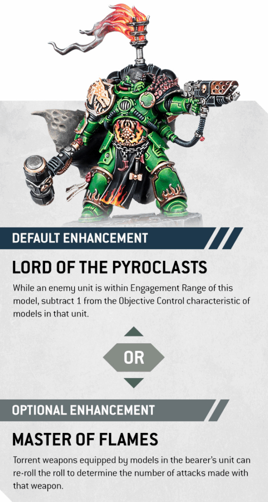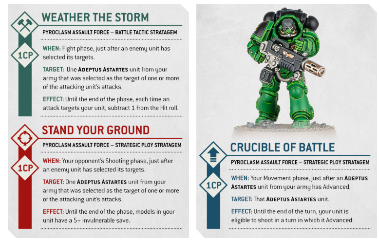 The Combat Patrol’s Stratagems focus on survivability and tactical aggression. Weather the Storm reduces incoming hit rolls, Stand Your Ground grants a 5+ invulnerable save, and Crucible of Battle lets units advance and shoot in the same turn. Essentially, these rules let you keep your Salamanders alive while still pushing up the board and torching anything in sight. The combination of speed, firepower, and defensive tricks makes the Pyroclast Assault Force feel like a fully tuned flamethrower on legs.