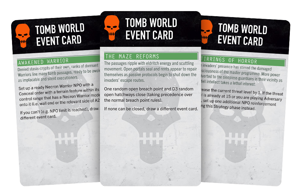 The Tomb World Dossier makes full use of this new terrain with Joint Ops and Adversary Ops missions. In Joint Ops, every action rises the threat level, which wakes more NPOs and forces the draw of Tomb World event cards. In Adversary Ops, the same terrain is used strategically by your opponents’ NPOs.