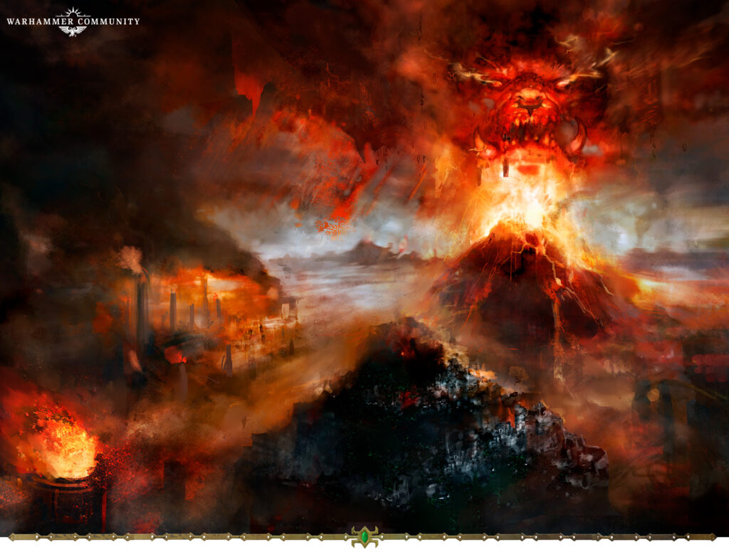 Yet his siblings baulked. Valaya, second-sister and hearth-guardian, cast doubt upon his bold ambitions. Oafish Grimnir objected out of hand, making groundless boasts of ties to Aqshy. Grungni was conniving. With feigned humility, he dazzled his siblings with his frivolous schemes for the Golden Realm and poured scorn upon Hashut’s designs out of jealousy. None spoke in their elder’s defence. Instead, with words of hollow flattery, they bade him settle lowly Ghur, claiming that only he could collar its beastly heart.
