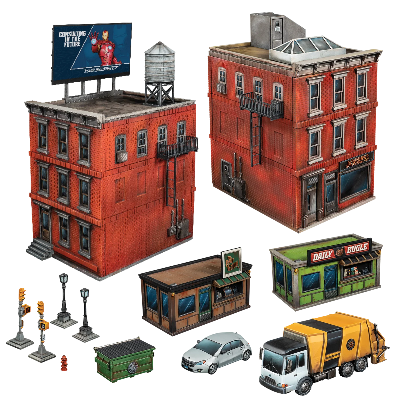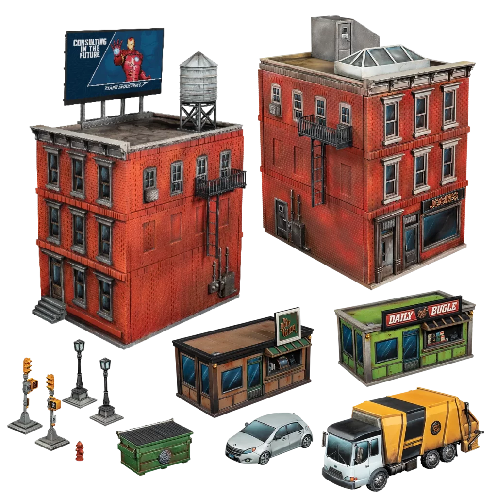 Starting with the set with the most pieces in the theme we have NYC urban terrain. The first core set started with this terrain and they’ve continued to support this theme up to a NYC City Block Terrain Collection coming later this year. These sets include: Core Set 1, Core Set 2, NYC terrain, NYC construction terrain, NYC commercial truck, NYC apartment building and the upcoming NYC City Block Terrain Collection. I think this is the most basic and most functional terrain set in the game. NYC terrain is almost universally functional and a joy to play with. Spider-Man, Daredevil, and Iron Fist all feel like they fit right in with this world and art style. All the most basic bases for MCP characters depict urban landscapes which also fit with this style.