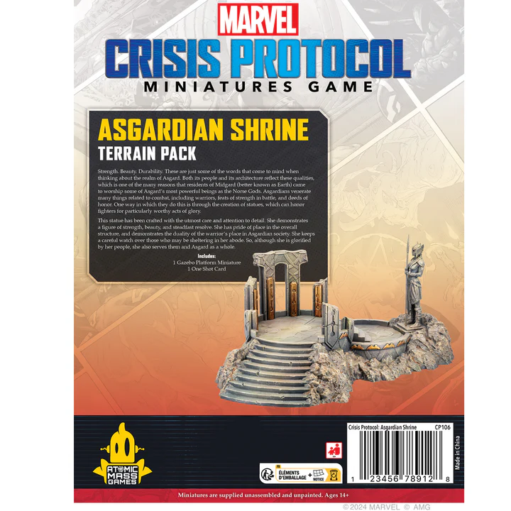 These terrain pieces depict the stonework and architecture of Asgard, the land of the gods and Thor’s homeworld. There are two terrain packs, the Battle for Asgard pack and the Asgardian Shrine pack. To start off, I think the Asgardian Shrine terrain piece is a really poorly designed play piece for MCP. The box contains basically one large terrain piece so it has quite a large footprint and there is very little usable space on top of the terrain to land miniatures.