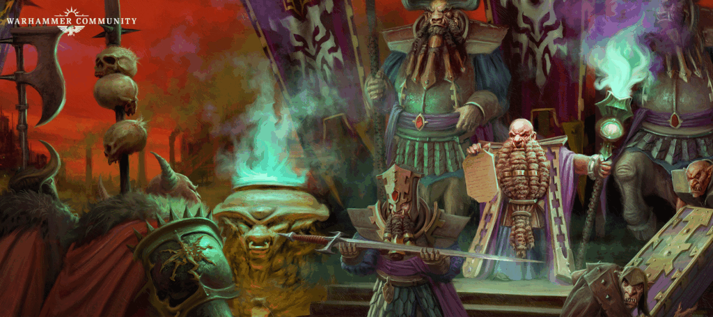 Zharrdron society reflects this hunger for control. Their rigid hierarchies are based on oaths and obligations, known as the Wage of Toil. Apprentices labor endlessly under cruel masters for scraps of knowledge, while despots extract power from their subordinates. Rival clans trade, plot, and scheme endlessly, all seeking to climb the hierarchy. Power is extracted as thoroughly as daemons are harvested, and every level of society is intertwined in chains of debt and obligation. Their armies are composed of proud, richly adorned warriors, while disposable hobgrot mobs fight in their shadows. Daemonsmiths maintain the engines of war, crafting helforged weapons and machines that echo the bull form of Hashut. These sorceries are both a symbol of status and a reflection of their corrupt power.