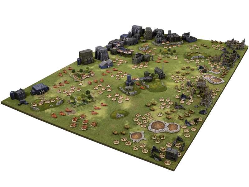 Unlike Legions Imperialis, which is set during humanity’s galactic civil war and has only 3 faction archetypes, Epic Warpath is set in Mantic’s version of the 41st Millennium and features 8 factions that are more or less analogous to those from GW’s setting. The core box comes with everything you need to play the game, including two armies: Enforcers (Space Marines) and The Plague (Nurgle). However, if you are not particularly interested in those two factions there are two more available at release with another four coming down the pipe. The rulebook is free on Mantic’s site, as is an army builder tool that war created during the kickstarter.
