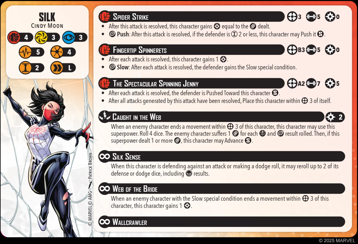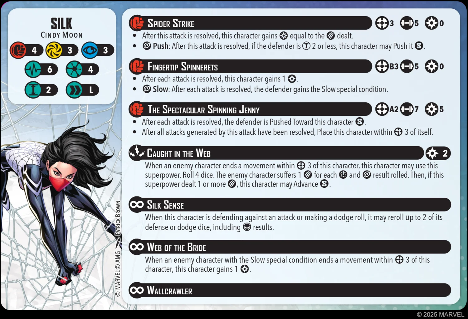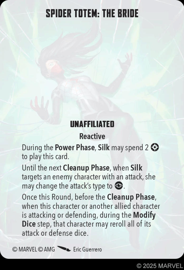 - Grants a one-time full dice reroll (attack or defense) for Silk or an ally.