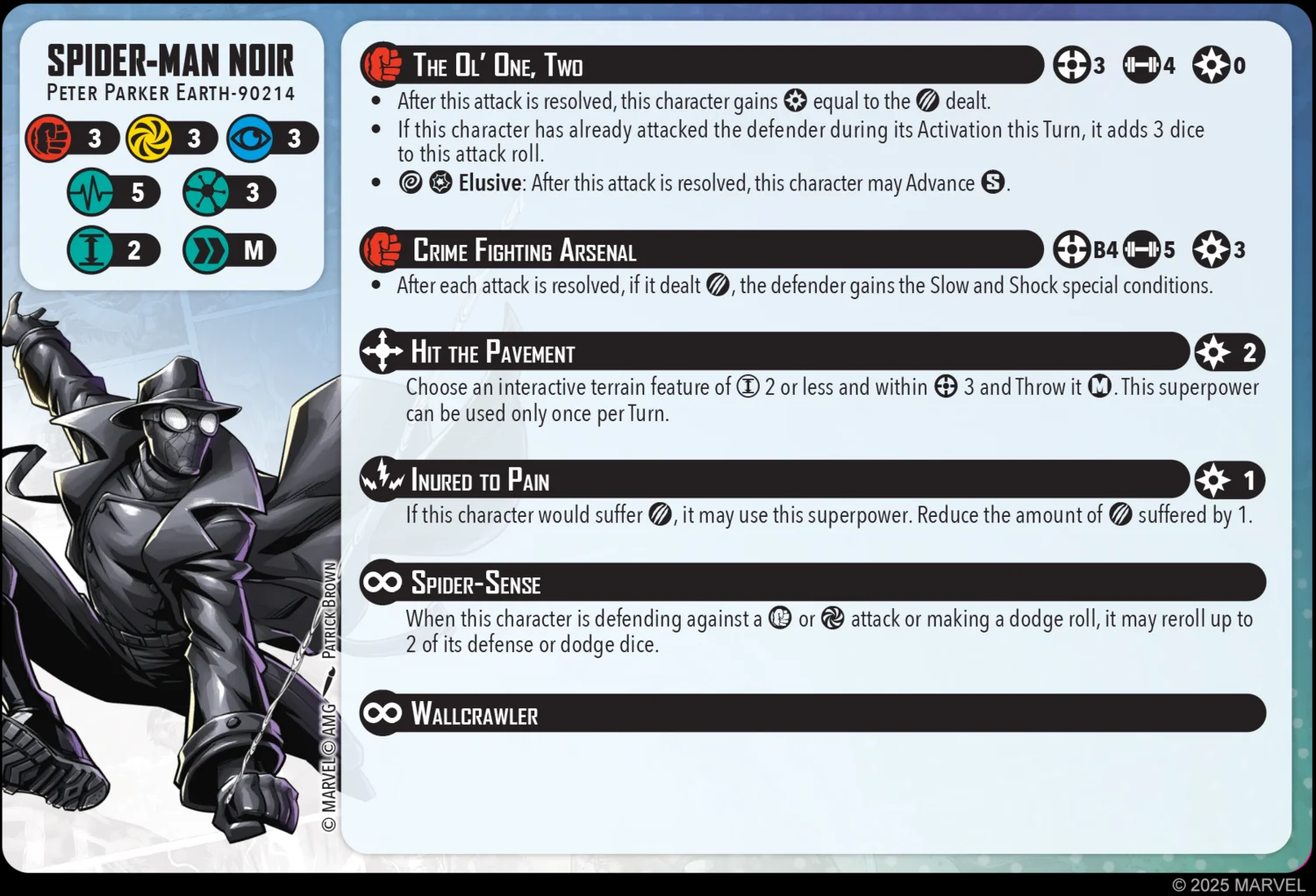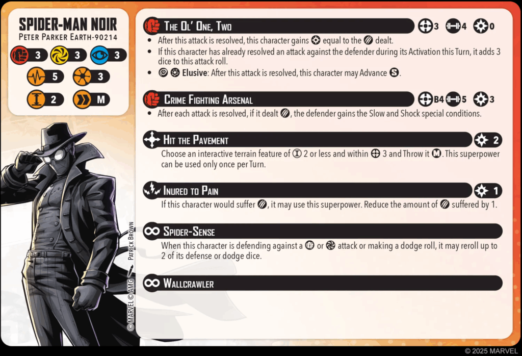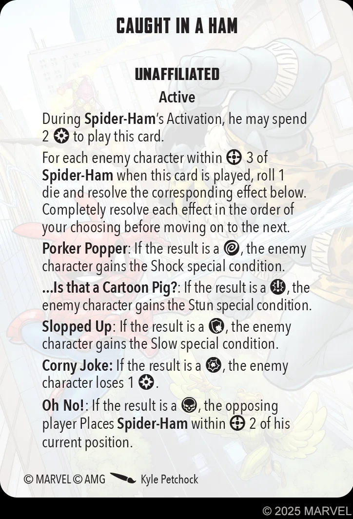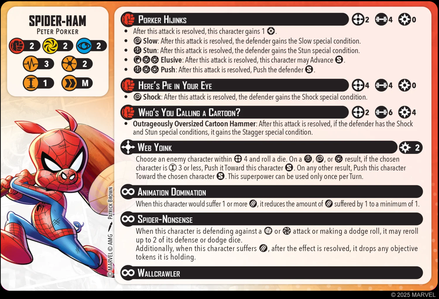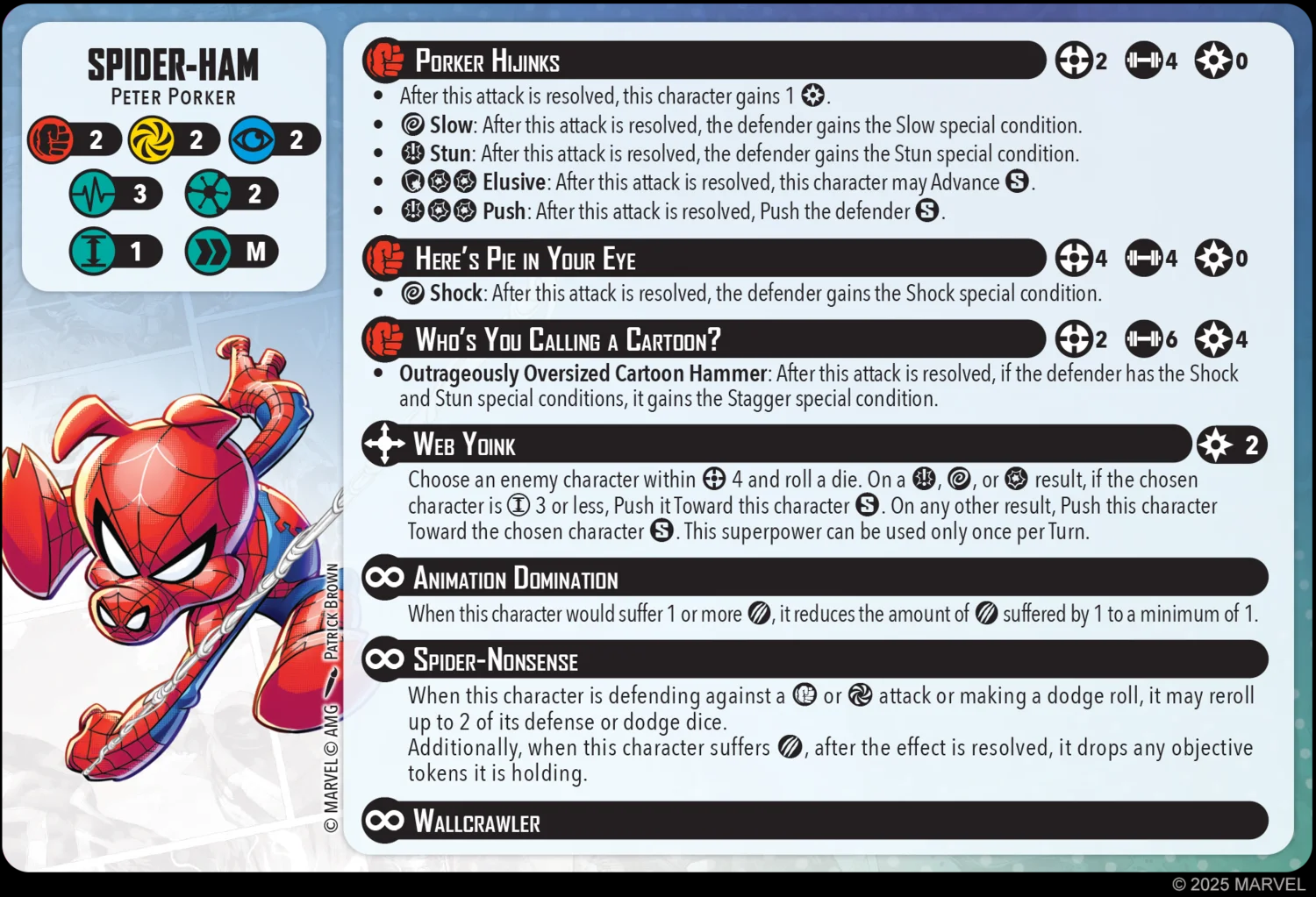 - Porker Hijinks: Strength 4, close range. Can cause Slow, Stun, Push, and allow Spider-Ham to Advance — but relies heavily on dice rolls.