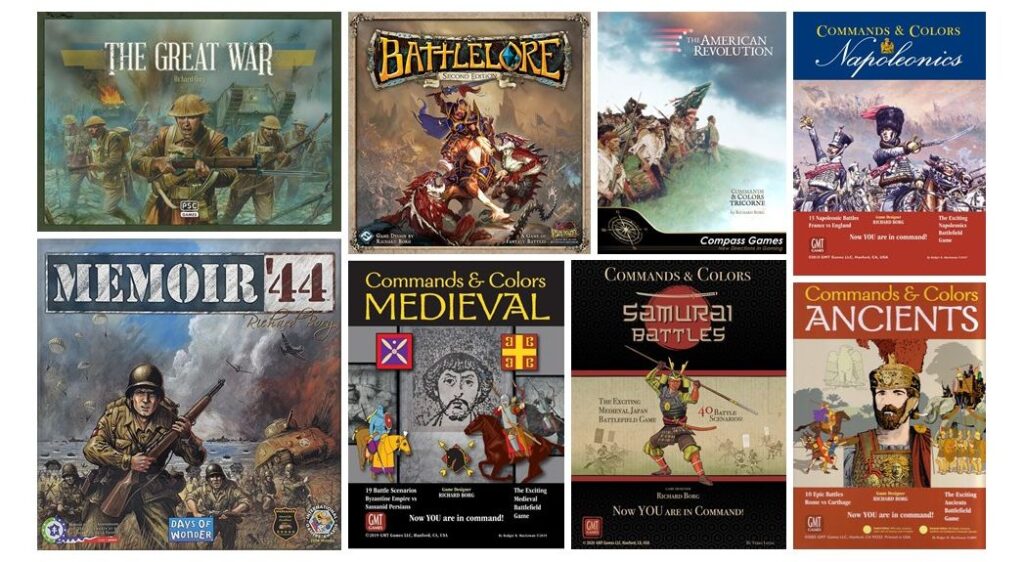 In 2000 Avalon Hill published a Civil War boardgame called Battle Cry that featured a game board covered in hexagons and split into three sections, as well as a load of miniatures. There were cardboard tiles that represented different terrain features, such as hills and woods, as well as cards that players used to activate their units. It was received quite well, and four years later Days of Wonder released Memoir ’44, a WW2 game that used the same system but with new types of command cards to better depict the period. Despite having very similar core mechanics these games played wildly differently and managed to impart some real period specific aesthetics. In 2006 GMT games released Command & Colors: Ancients and the game system had its name. After Ancients came Battlelore, set in a traditional fantasy world with orcs, dwarves and the like, Then Napoleonics, Samurai, Battlelore with a reimagined setting, and many more.
