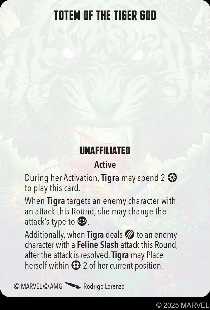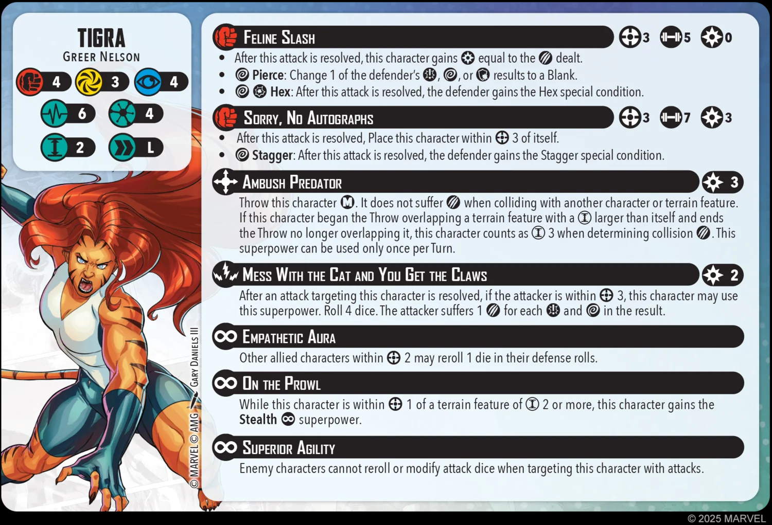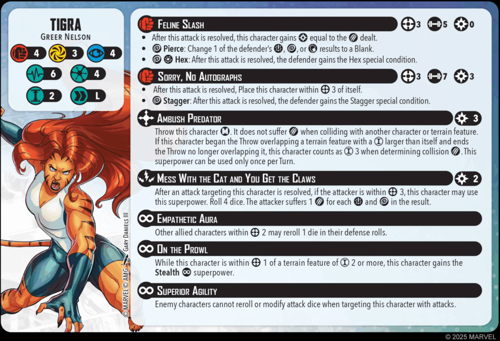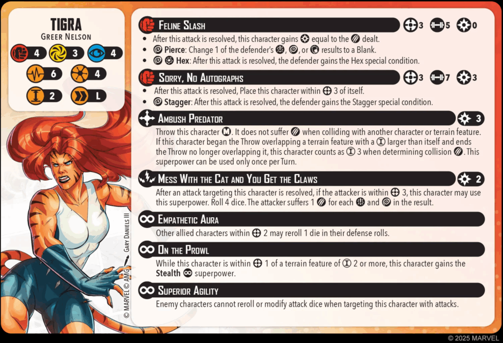 - Tigra uses burst mobility, condition stacking, and powerful reactive damage