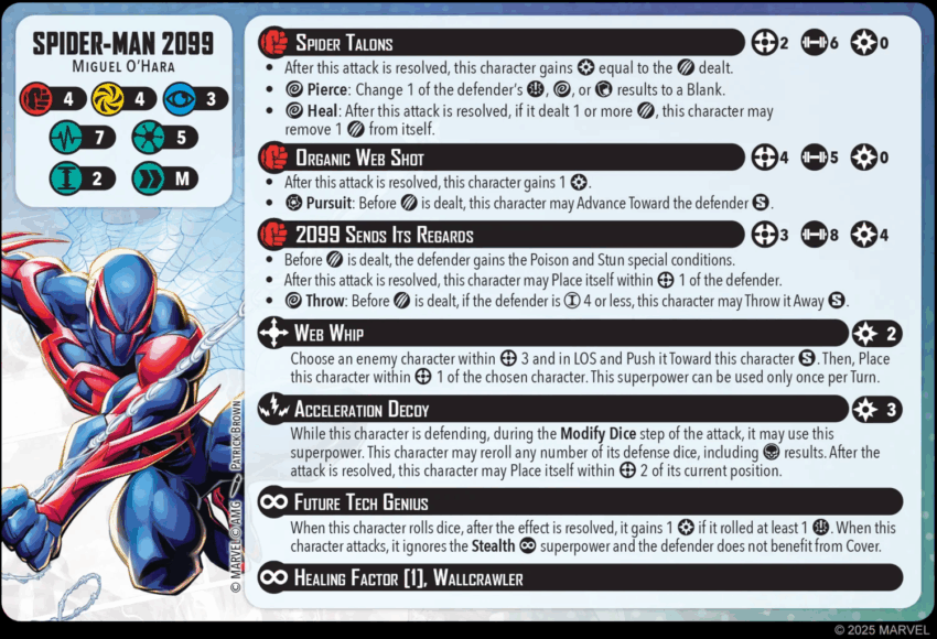 Spider-Man 2099 does have movement tech in the form of his Range 4 Organic Web Shot attack which on a hit allows him a short advance toward the defender. His spender will also Place him next to his target and his Web Whip superpower will displace an enemy model in addition to moving him next to the target. His spender can help deal with Size 4 enemy models and his builder heal with Healing Factor will make his effective health pool higher than the printed 7/6. He should be able to pay for a lot of his costs since he also generates power whenever he rolls a Crit.