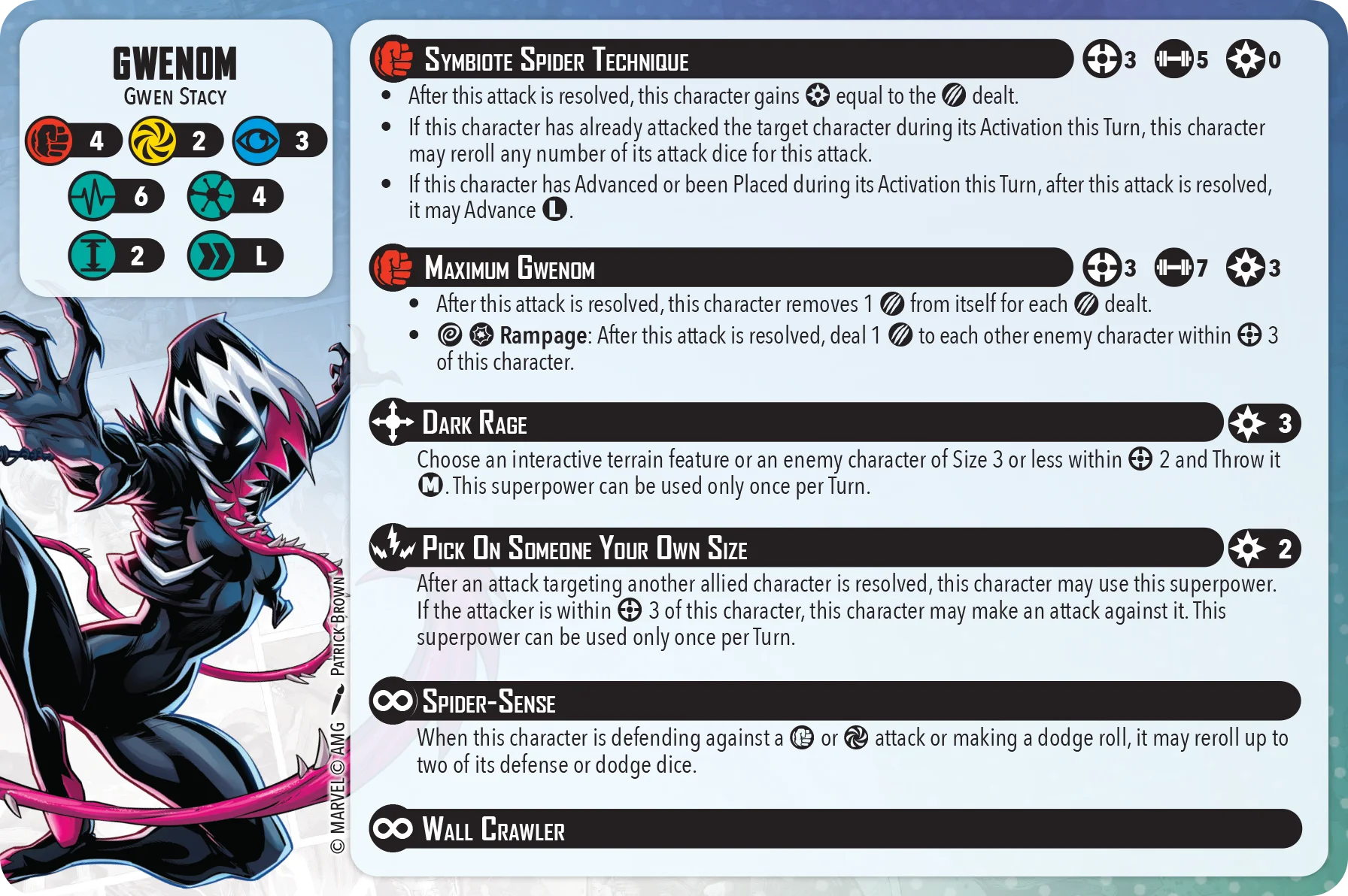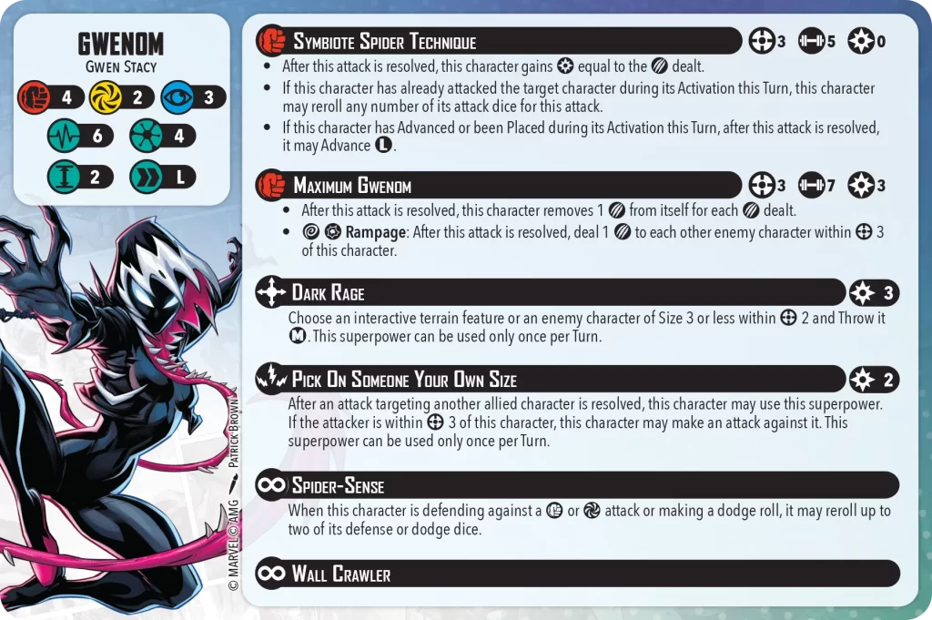 There are several other strike back type superpowers in the affiliation that I think would be good inclusions. Gwenom’s strike back is only triggered when an enemy model has attacked one of your allies and the enemy is within Range 3 of Gwenom. It only costs 2 Power and lets you pick either your builder or spender attack to use (although you still have to pay the extra power for the spender). The builder is a 5 dice physical attack but if you hit the Skull for the Spider-Verse Place then you will also get a free Long advance. Her Spender is a 7 dice physical attack but heals her for damage dealt and has a Wild + Hit trigger to splash more damage to enemy characters within Range 3. She has an enemy model Throw so I think it’s highly synergistic with our current game plan.