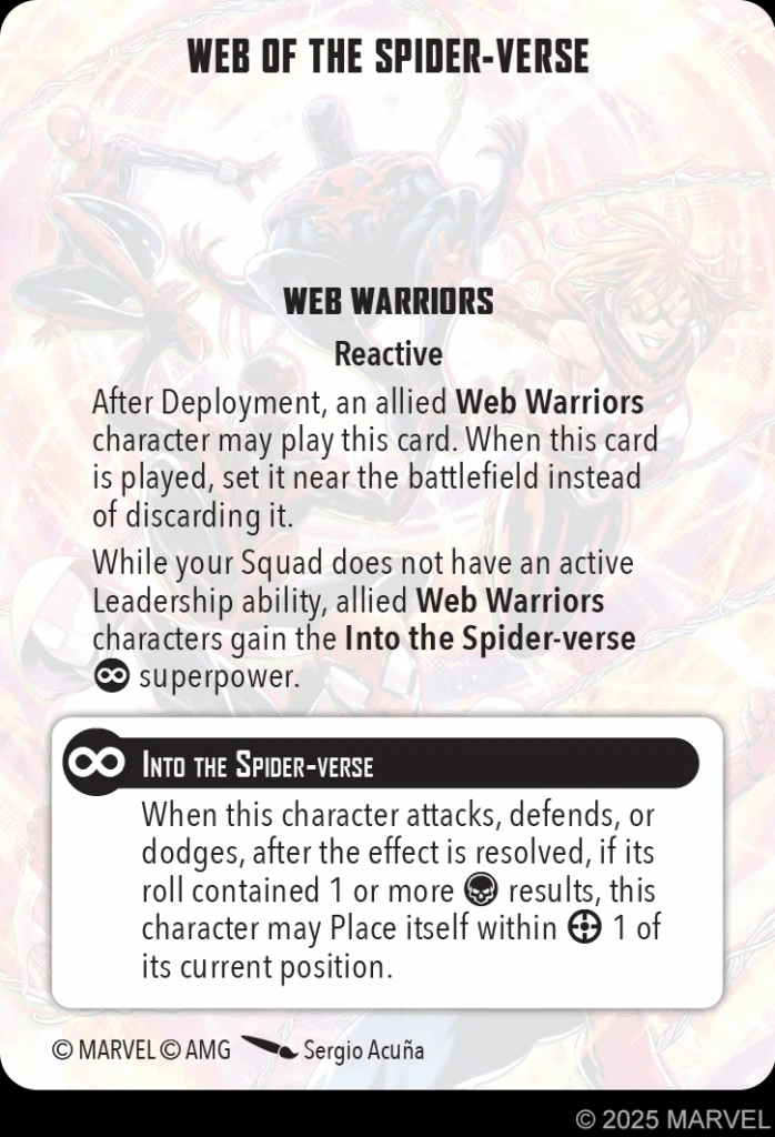 Since we’re leaning into the Ultimate Spider-Man model, I’m not going to be taking 3 Threat Miles Morales Spider-Man for this test list. (Eventually he’ll probably make his way back in, but lets try something new for now.) I will take Amazing Spider-Man as a leader for the affiliation, but that doesn’t mean we need to be taking him every game. A new Team Tactics card coming with the new models, Web of the Spider-Verse, is a superpower you give all of your affiliated Web Warriors models as long as you don’t have an active leadership.