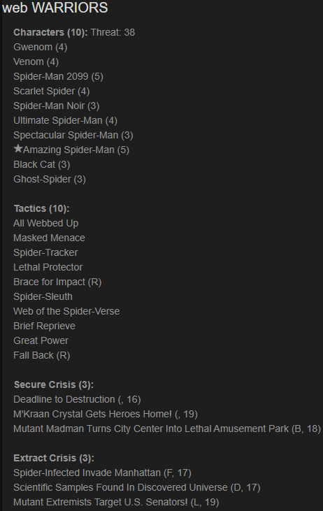 ASM has a leadership on his card I’m happy to play, but I think I’m going to lean into the Spider-Verse TTC for now. I’m going to bring some other Web Warrior TTC all-stars like All Webbed Up to enhance my brawling plans even more, Masked Menace which will reward my damage with additional power, and Spider-Tracker which can get a low health allied model out of Range of an enemy models coming at them. Spider-Sleuth TTC will be coming with Noir and the new Brief Reprieve TTC is attached to Ultimate Spider-Man for extra healing or removing a pesky special condition. Spider-Man 2099’s TTC Great Power can enhance his attacks but I’m not sure it’s good enough for a TTC spot. Lets try it out and see it in action. Finally, my two Restricted cards will be Brace for Impact and Fall Back. I think they are going to be generically good cards I will always be happy to take.
