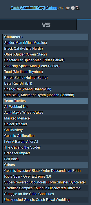 My Secure Crises are Deadline to Destruction, M’Kraan Crystal Gets Heroes Home!, and Mutant Madman Turns City Center Into Lethal Amusement Park. My Extract Crises are Spider-Infected Invade Manhattan, Scientific Samples Found in Discovered Universe, and Mutant Extremists Target U.S. Senators! I chose Crises with lots of interaction, lots of Extracts available for scoring, and shapes that I think Web Warriors would be able to rotate between easily and continue the game plan of brawling and kicking enemy characters off of points. I’m not locked in to these Crises so with some practice I can see them changing.