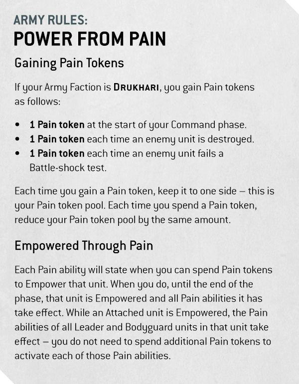 Power From Pain still feeds on cruelty, but now it feels personal. You gain Pain tokens at the start of each Command phase. Additionally, you gain tokens when enemies are destroyed or fail Battle-shock. Then you spend tokens to Empower a unit when its datasheet allows. While Empowered, that unit’s unique Pain ability switches on for the phase. Moreover, Leaders and Bodyguards in an Attached unit also light up for free.