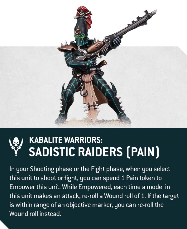 Every unit has its own twist, from chaff to queen. Kabalite Warriors become Sadistic Raiders when Empowered. They re-roll wound rolls of 1, or all wounds against targets on objectives.