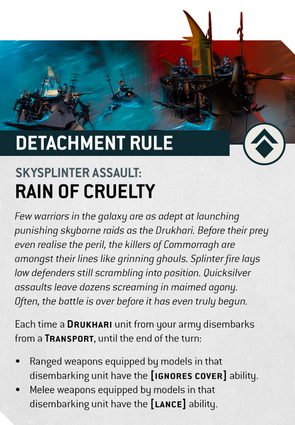 Skysplinter Assault embodies classic fast-raid cruelty. When a Drukhari unit disembarks, its ranged weapons ignore cover for the turn. Additionally, its melee weapons gain Lance for harder first impacts. This overlaps beautifully with Anti-Infantry profiles, since cover often saves bodies. Moreover, the detachment supercharges Raider launches into murder-turns. Enhancements and Stratagems push this further by buffing units after the jump. They also toss help to the transports themselves for extra bite and staying power.