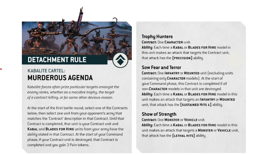 Kabalite Cartels hunt for pay and prestige, so you pick a Contract. At the start of the first round, tag an enemy that fits the chosen brief. If you kill that Contract unit, you bank three Pain tokens. Trophy Hunters targets a Character and grants Precision against it. Sow Fear and Terror picks Infantry or Mounted, rewarding you with Sustained Hits 1. Show of Strength singles out a Monster or Vehicle and grants Lethal Hits. Consequently, your alpha plan and token economy both spin off one decision.