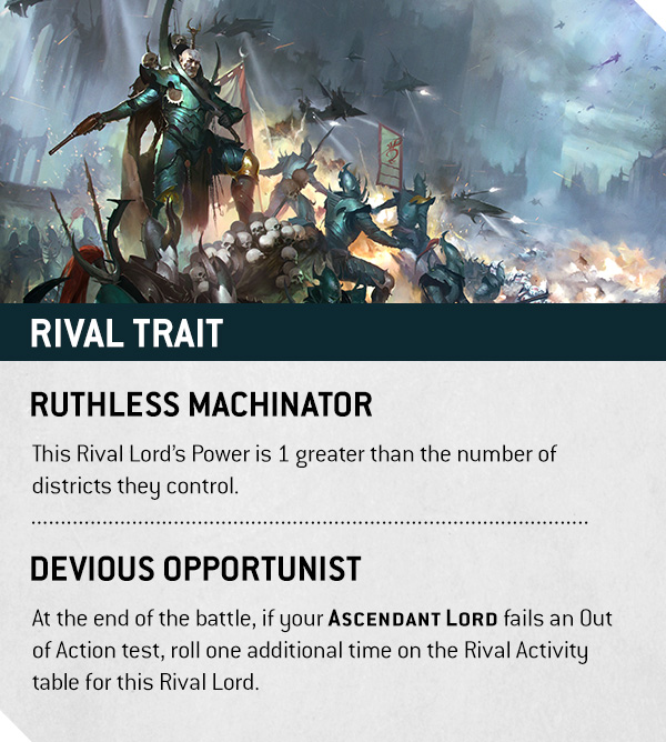 Between games, rivals act in the shadows. Under New Management gives a rival another district on the spot, with takeovers if contested. Additionally, an Assassination Attempt forces a Leadership test on your Ascendant Lord. You gain one experience if you live, and you take a Battle Scar if you fail. Therefore, even downtime is lethal, and survival still leaves marks.
