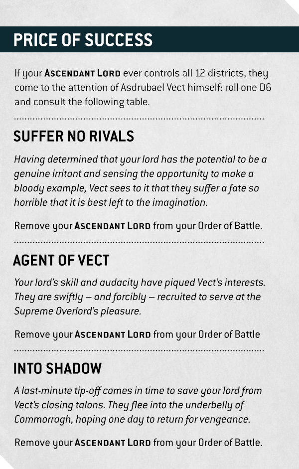 Master all twelve district categories and Commorragh notices. Moreover, Asdrubael Vect notices, which is far worse. You roll a die and consult the Price of Success. However, every result removes your Ascendant Lord from your order of battle. The names differ, from Suffer No Rivals to Agent of Vect to Into Shadow. Consequently, triumph invites extinction, recruitment, or flight into the undercity.